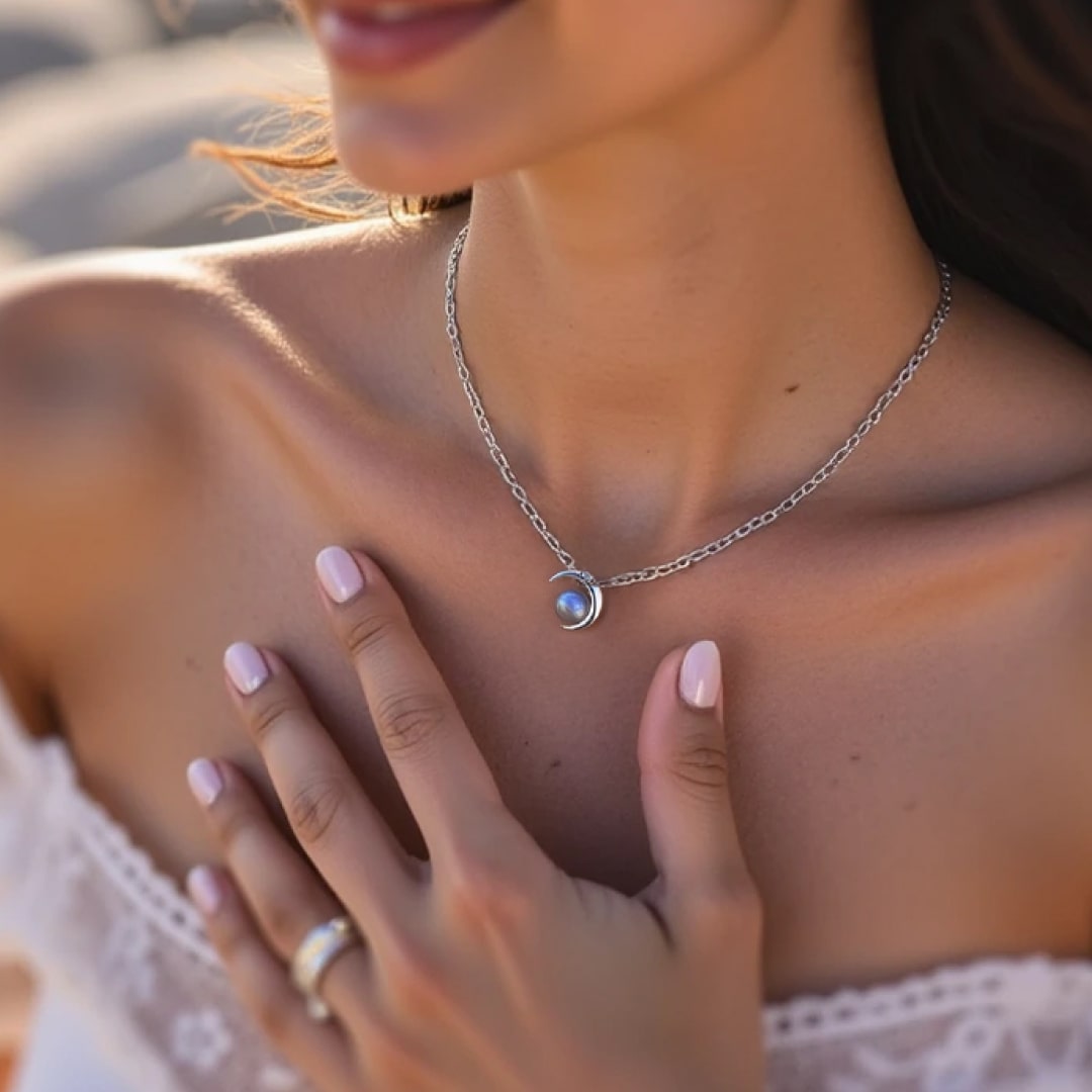 The pendant’s design, featuring a delicately sculpted silver moon, perfectly captures the mystical essence of the night.